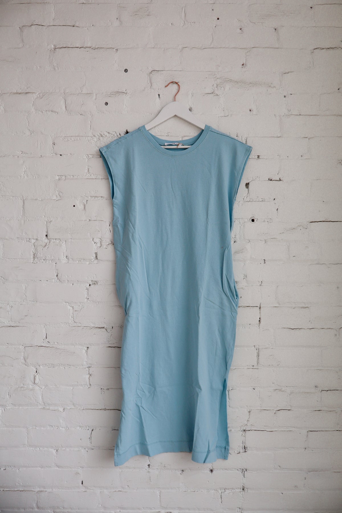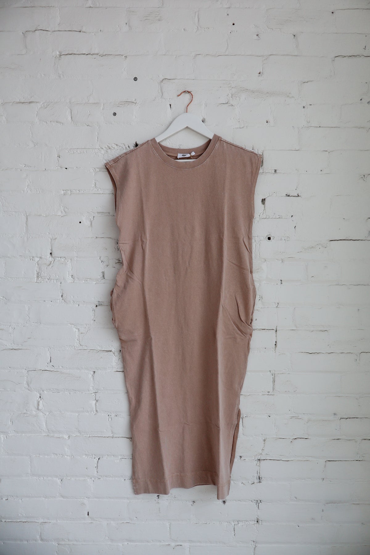 This essential oversized fit midi dress is crafted from soft, breathable cotton, featuring a mineral wash finish for a lived-in texture and rich, garment dyed hues. The design includes a crew neckline, slightly extended cap sleeves, functional side-seam pockets, and side slits. Pair with ankle boots and a bold belt for effortless style.