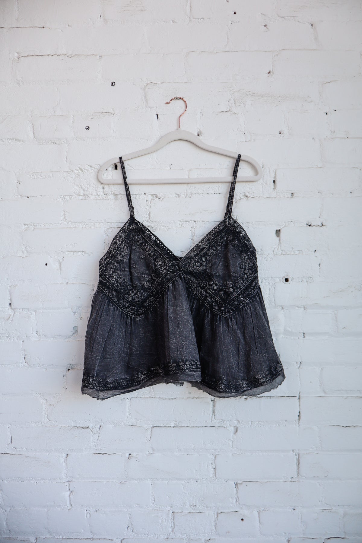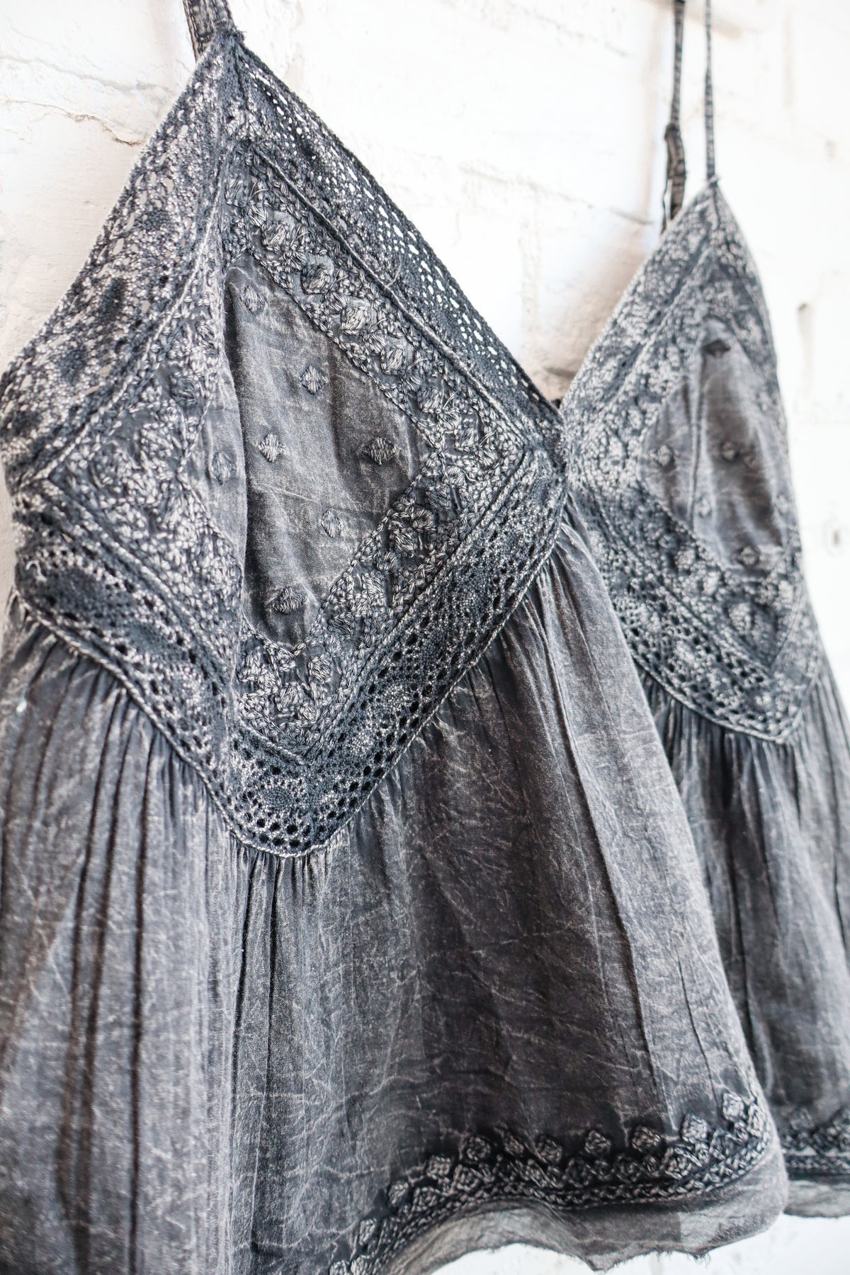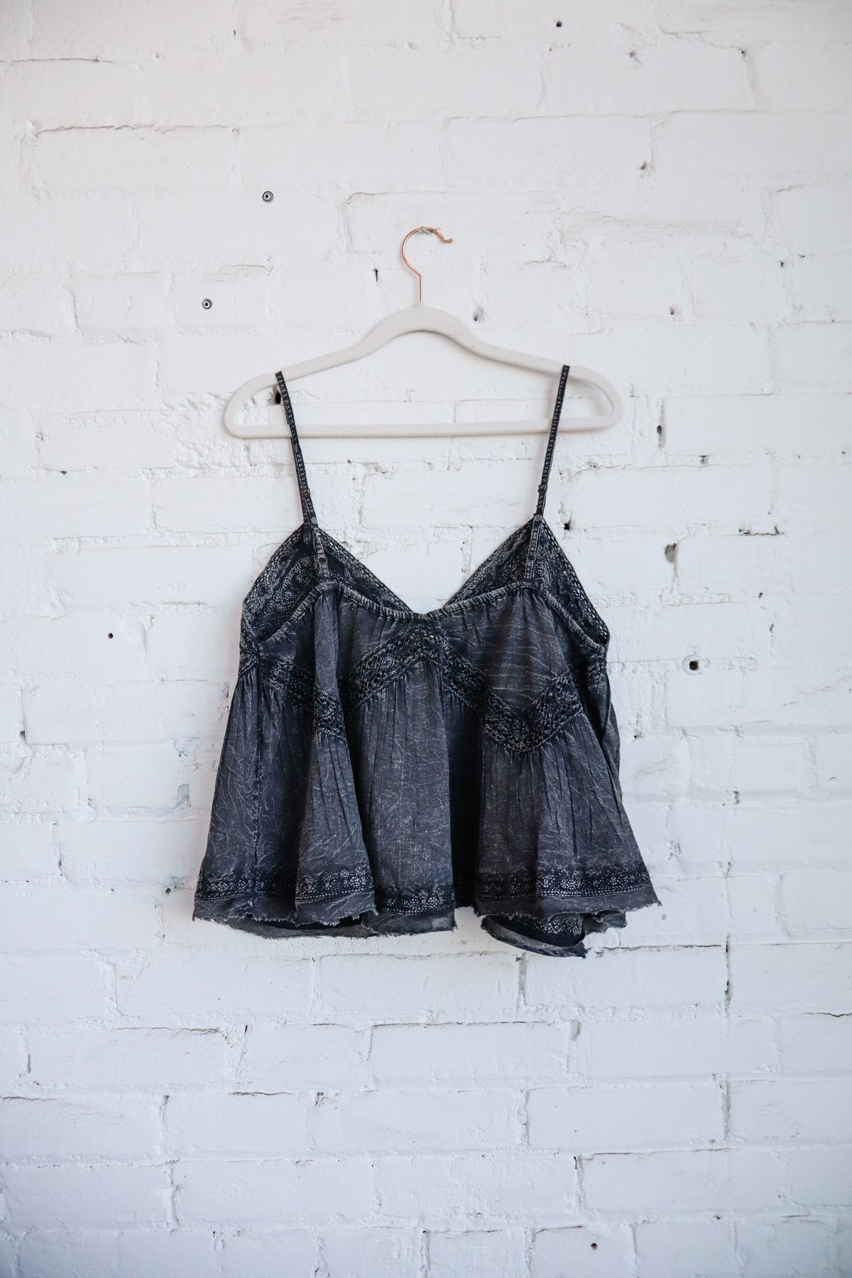 Designed in V-neck regular fit sleeveless top in embroidered woven with lace trim, raw edge, hanger chief hem, and washing effect.