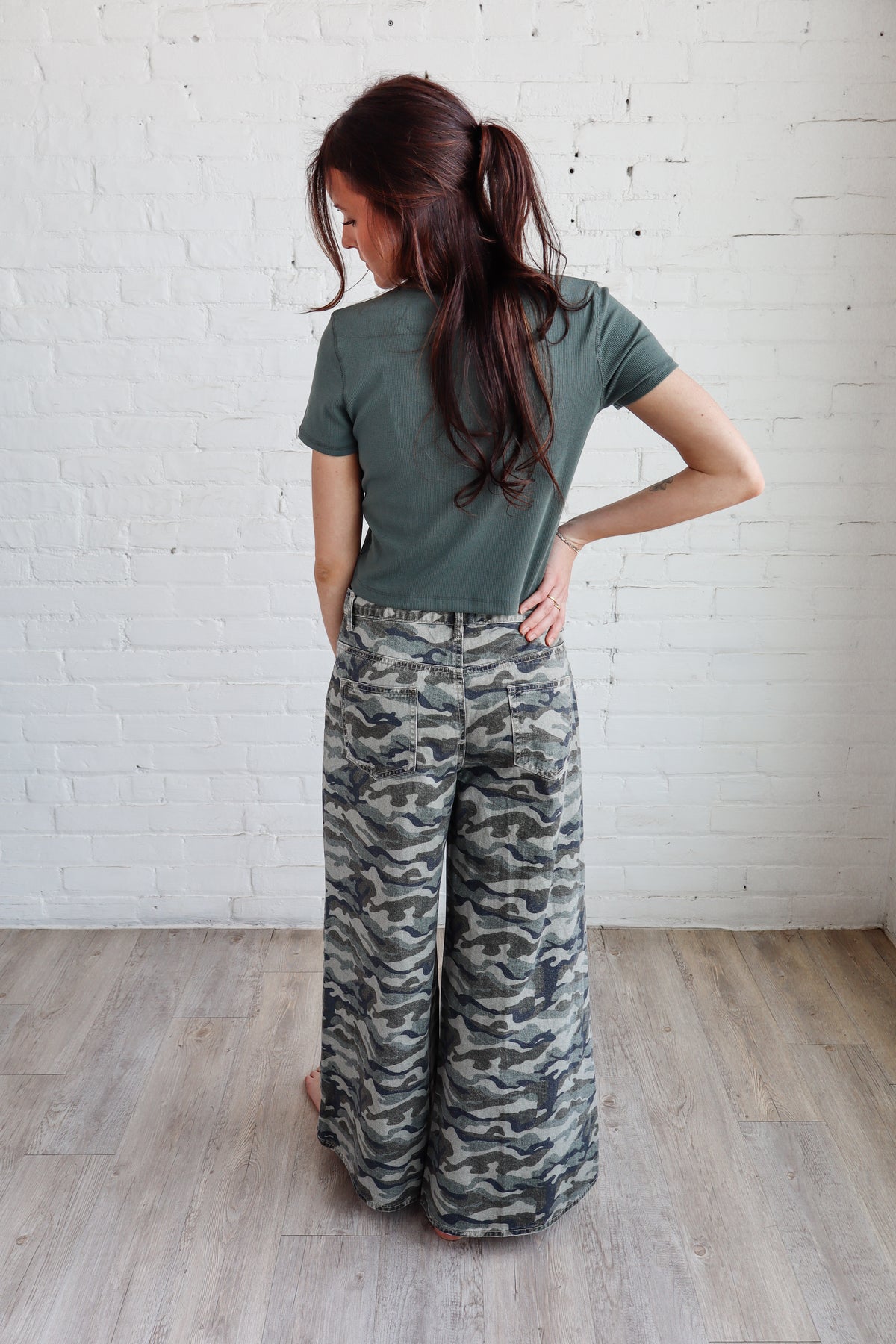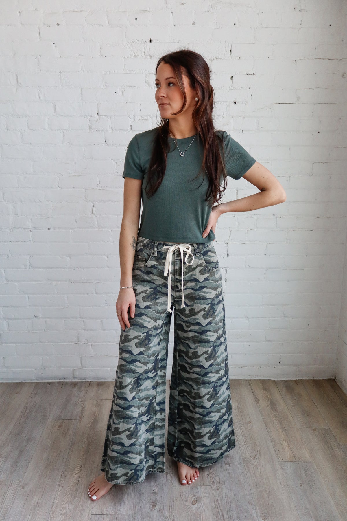 -camo printed -waist drawstring -front pockets -washed -wide legged